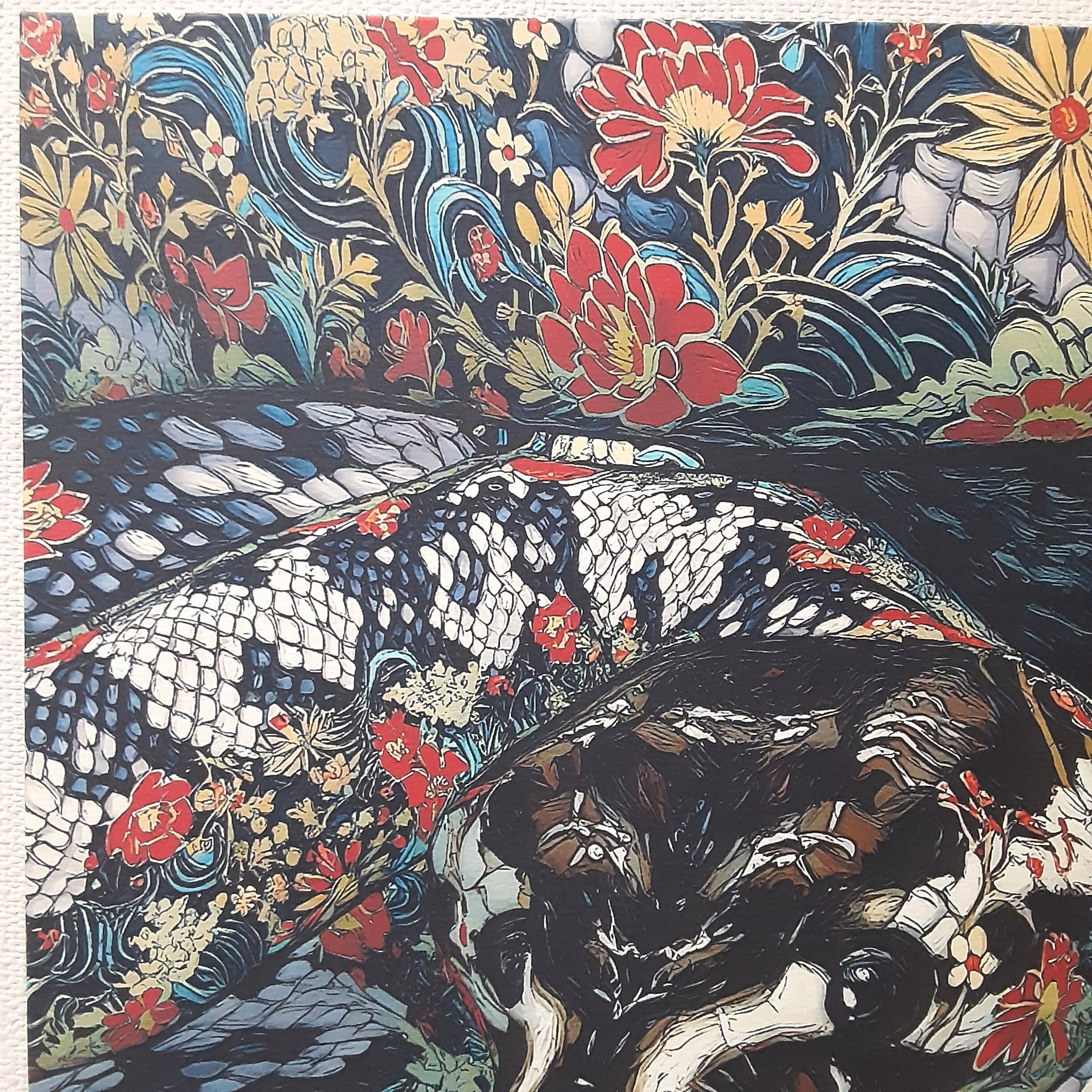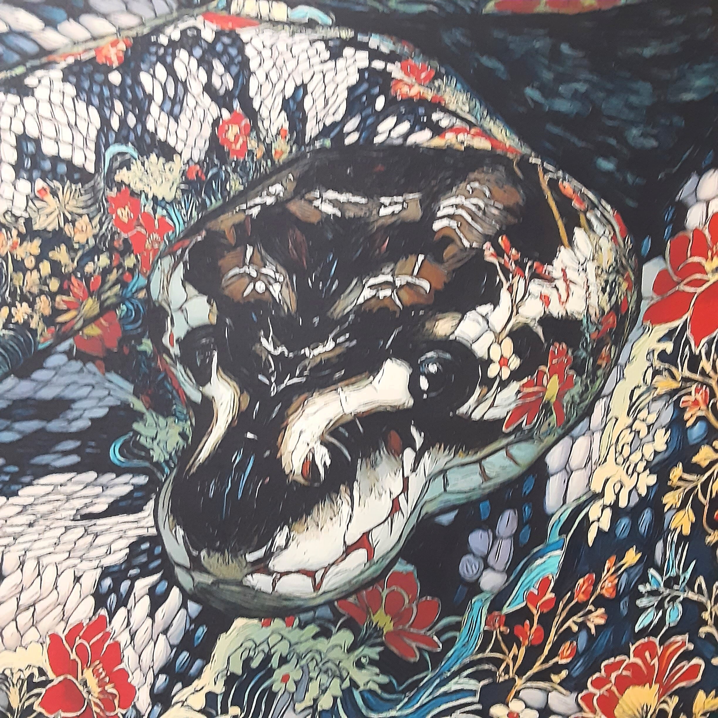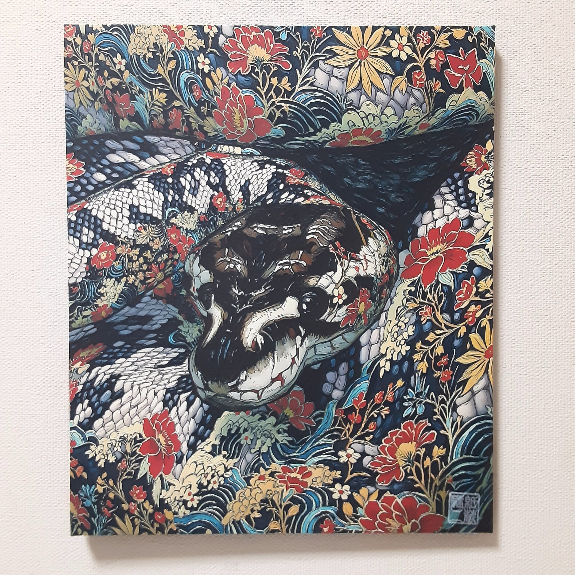 ボールパイソンの絵画です。実際にこんなに美しい蛇が存在したらという夢を描きながら描きました。