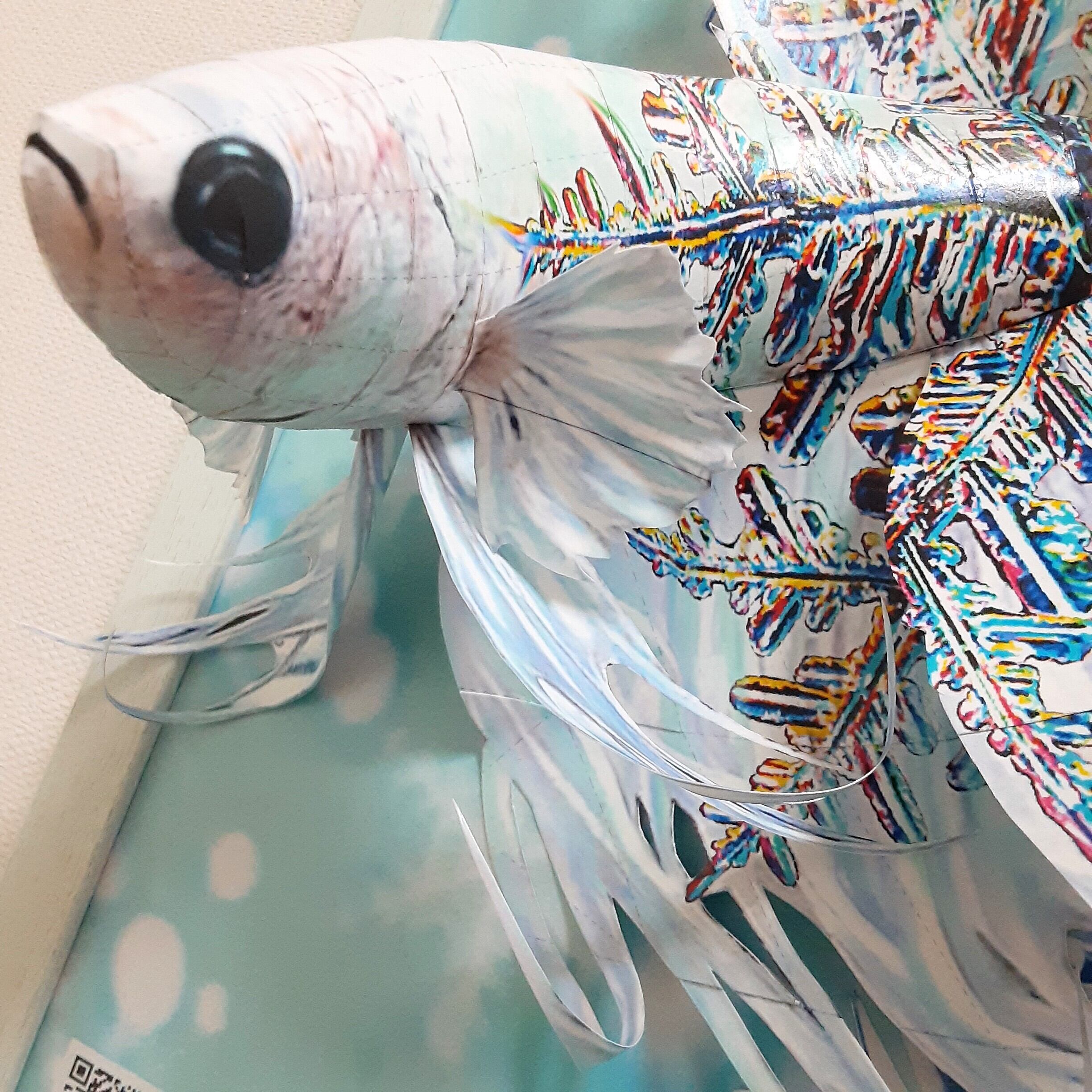 雪の結晶を体にちりばめ美しく幻想的に泳ぐ白クラウンテールのペーパークラフトです。